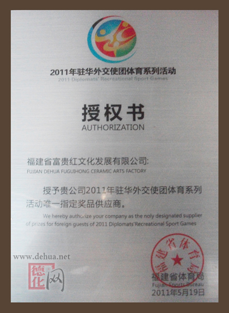 2011年5月20日,福建省富貴紅文化發(fā)展有限公司《火紅柿》、《觀音瓶》、《盛世陽光》等藝術作品在駐華外交使團體育系列活動中成為唯一指定獎品。