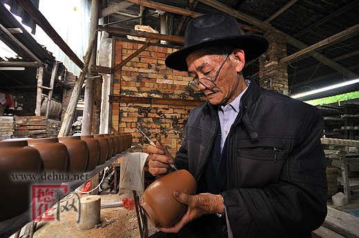 盡管之前并沒有嘗試過在陶坯上的刻畫的經(jīng)歷,但老藝人顏義哲卻當場就信心滿滿的應承下來。原來,顏義哲曾經(jīng)是一名德化陶瓷廠的老員工,早在1956年,當年他還是一個剛滿20歲的小伙子,就開始從事陶瓷彩繪工作,正是這30多年的彩繪工作經(jīng)歷,使他有信心在陶瓷坯上刻好畫。