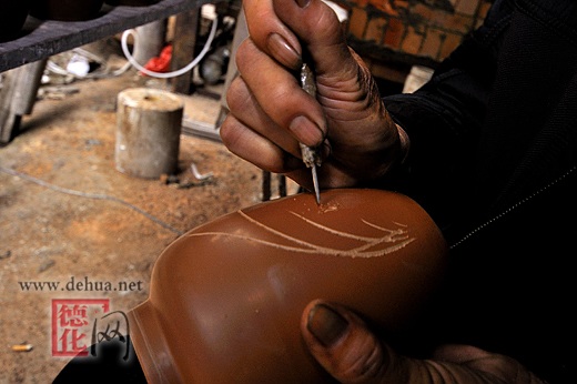 顏義哲和臺灣客商洽談的生意,短期就交易結束,但他卻從此喜歡上在陶坯上刻畫的藝術,而且,這一堅持就是二十幾年。如今,刻畫技藝越來越嫻熟的他,不用在陶坯上用筆勾畫輪廓,就能將腦海中構思好的圖案一氣呵成地刻在陶坯上。