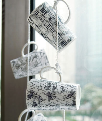 涂鴉圖案風格的瓷質水杯,主題風格鮮明,年輕的瓷器控超級喜愛。一次購買多個圖案的杯子,用結實的尼龍繩把杯子一個個地穿起來,綁牢固,懸掛在窗前,就變成一串風格獨具的大號風鈴,個性又帶有畫家風格。