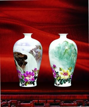 《源・脈》對瓶特選經(jīng)典梅瓶造型,器型端莊,胎質(zhì)潔白通透,色澤柔和鮮亮,融筆意、詩情、畫理于一體,準(zhǔn)確生動的描繪,美不勝收,柔美中有雄渾之氣。觀黃河壺口瀑布飛流直下,覽八達嶺長城雄偉壯觀,賞牡丹花枝繁葉茂,有景有意,氣韻悠長。通過大紫、淺綠等色彩斑斕而有序的搭配運用,達到了一種遠(yuǎn)看色、近看花的奇特效果。一束束流暢游動的線條,一處處開合有度、錯落聚散的皴點,一塊塊對比和諧的色彩,其純度、厚度、透明度猶如春天的陽光清澈明凈。大膽的用色和用筆,給人一種艷麗脫俗之感,恰到好處地表現(xiàn)了牡丹花國色天香的高貴品格。整體畫面虛實相生、動靜相襯的裝飾手法,具有強烈的視覺沖擊力。