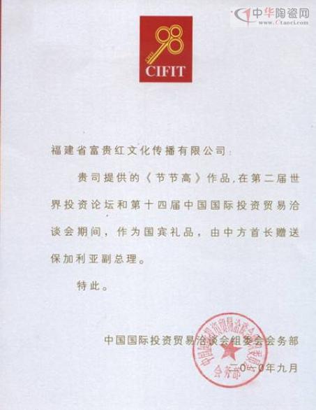 富貴紅陶瓷工藝品《節(jié)節(jié)高》曾作為2010年中國(guó)國(guó)際投資貿(mào)易洽談會(huì)官方指定的要員、貴賓、國(guó)賓禮品,由國(guó)家副主席習(xí)近平贈(zèng)送給保加利亞等一些國(guó)外國(guó)家領(lǐng)導(dǎo)人。