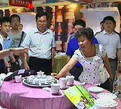 【同期聲 福杰陶瓷有限公司內(nèi)銷業(yè)務(wù)員 張光華:這是我們公司新推出的一塊富貴吉祥轉(zhuǎn)盤茶具,它可以傳動,讓顧客使用起來更方便!
