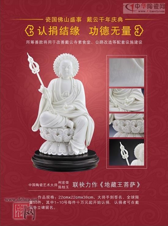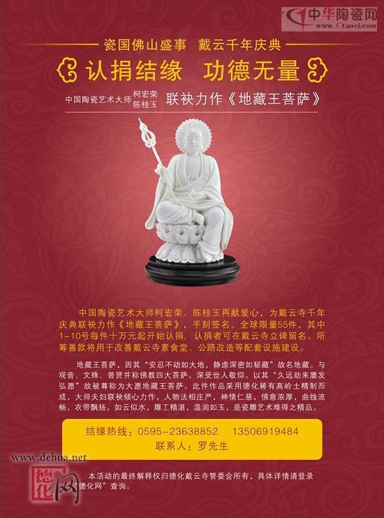 中國(guó)陶瓷藝術(shù)大師柯宏榮、陳桂玉再獻(xiàn)愛(ài)心,為戴云寺千年慶典聯(lián)袂力作《地藏王菩薩》,手刻簽名、全球限量55件,其中1-10號(hào)每件十萬(wàn)元起開(kāi)始認(rèn)捐,認(rèn)捐者可在戴云寺立碑留名。所籌善款將用于改善戴云寺素食堂、公路改造等配套設(shè)施建設(shè)。