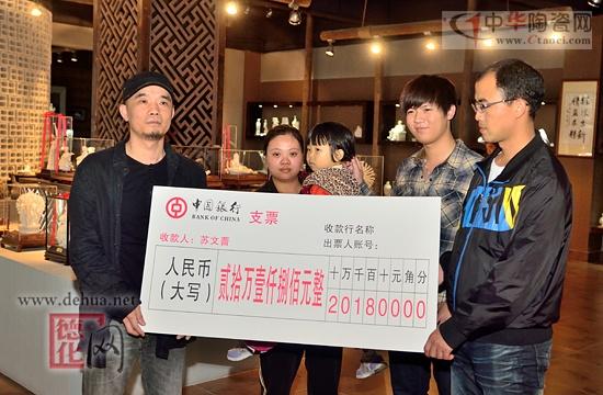 來自各地的多位愛心款認捐者在蘊玉瓷莊,高興地領(lǐng)回由蘇獻忠大師創(chuàng)作的10尊限量版“水月觀音”。