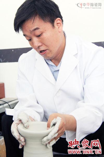 河南省非物質(zhì)文化遺產(chǎn)絞胎瓷傳承人柴戰(zhàn)柱在演示絞胎瓷的制作流程。