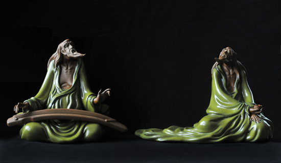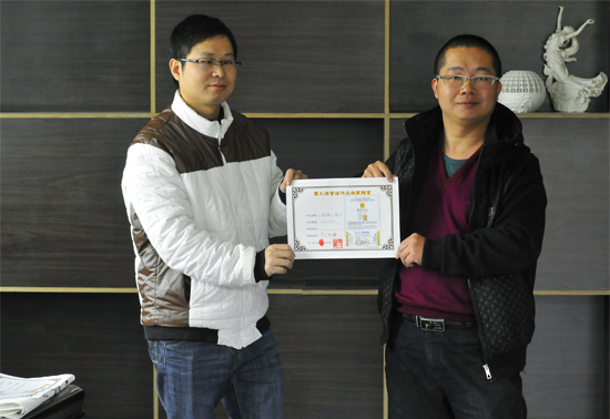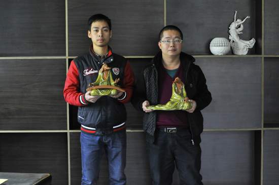 南安收藏家潘先生與德化年輕陶藝家王順合影 手簽精品<<知音>>