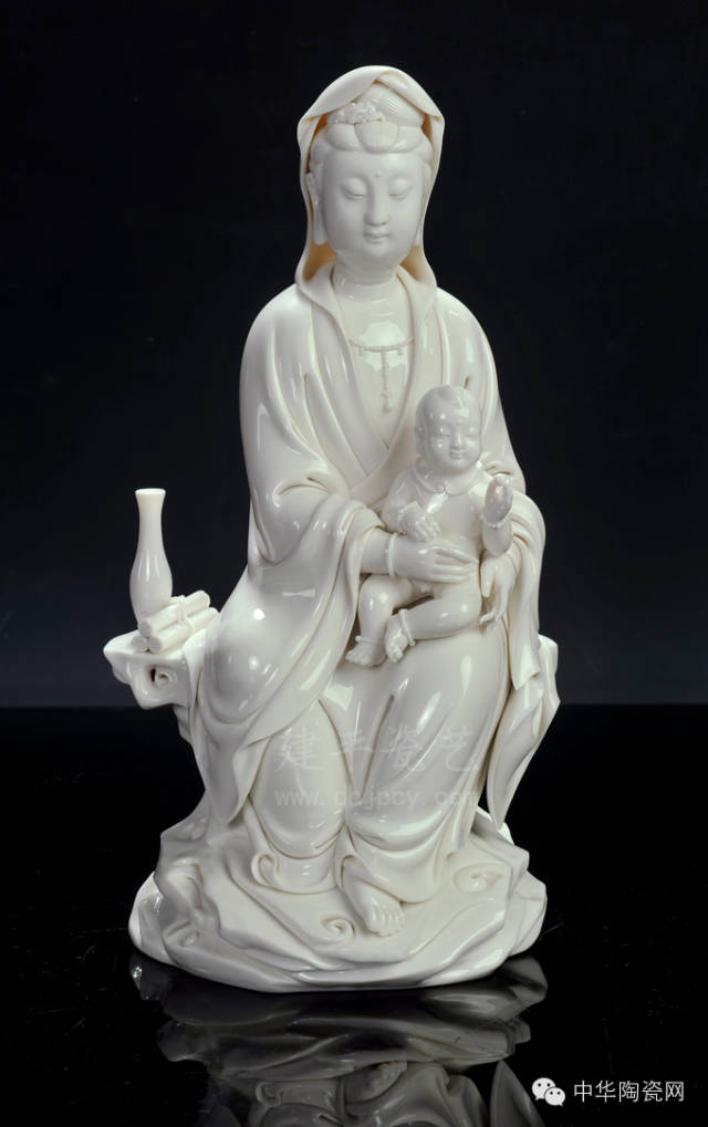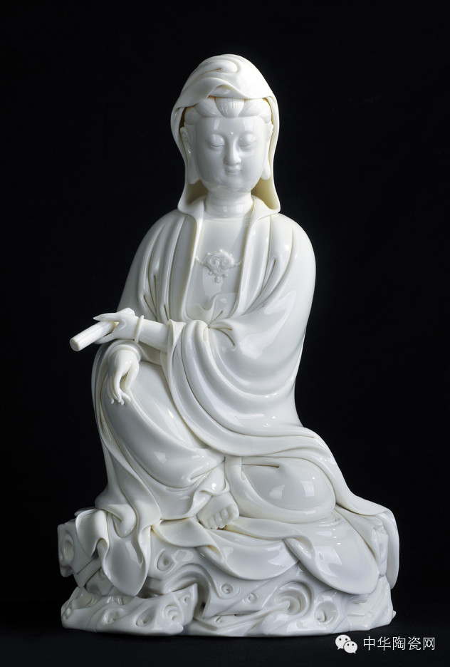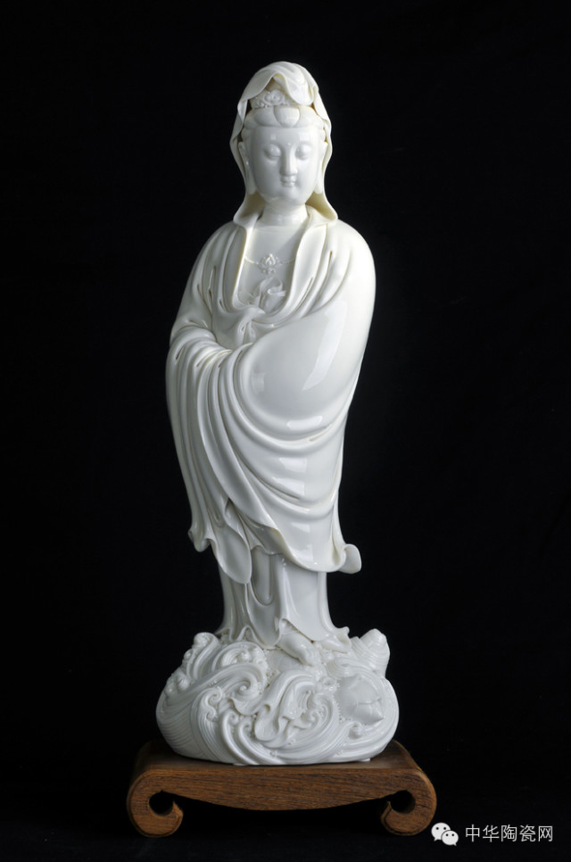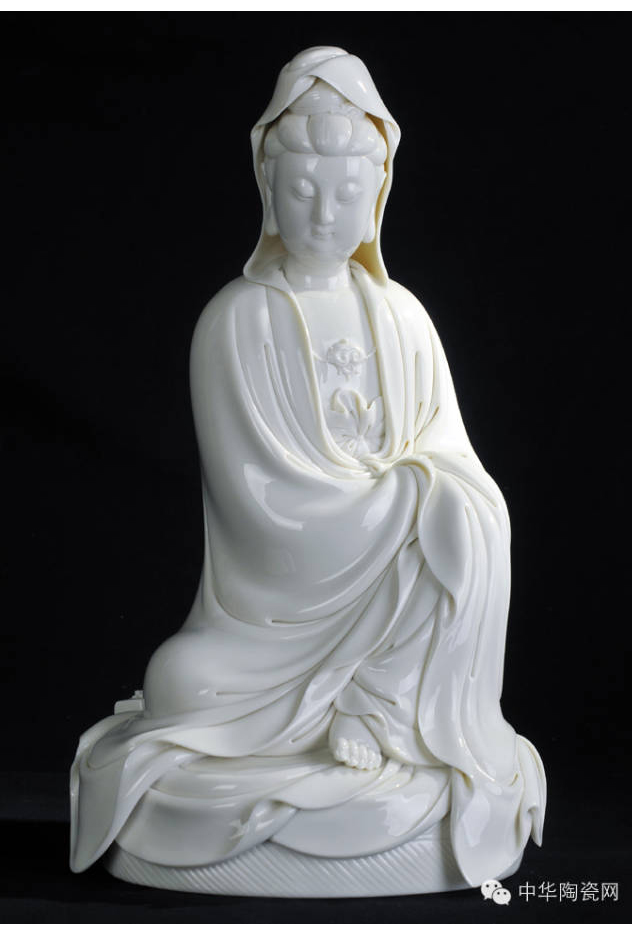《渡海觀音》以德化白瓷為胎質(zhì),圓勁有力如凝脂似玉,滋潤(rùn)瑩滑。線條清晰、簡(jiǎn)潔、瀟灑,多變化,柔媚流暢,翻轉(zhuǎn)自然,觀音雙手藏袖,露一足踏蓮花,另一足水花掩蓋,作踏浪凌波渡海之勢(shì)。神情嫻雅平靜,安詳自若,雙目低垂凝思。整座塑像精巧細(xì)致,神態(tài)如生。該作品2013年被永久收藏于福建省非物質(zhì)文化遺產(chǎn)博覽苑。