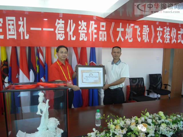 《大地飛歌》成為“2008年中國—東盟博覽會指定國禮”,贈送給東盟各國國家領(lǐng)導(dǎo)人,并載入東盟史冊;2010年泉州霞洲媽祖宮赴臺灣臺南大天后宮祭奠之時,德化瓷塑作品《大地飛歌》被作為禮品贈送給國民黨主席馬英九。