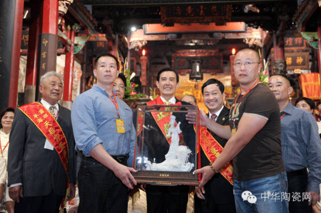 悠悠漓江水載著美麗的劉三姐和綻放的菊花與牡丹花,白瓷釉色潔白凝厚,溫潤雅致,把劉三姐塑造得更加清秀俊逸、超凡脫俗。踏著竹排在漓江上漂流的“劉三姐”手持繡球欲向情歌拋去……這廣西特有的動人風(fēng)情畫面,就是德化“中國白”瓷雕《大地飛歌·劉三姐》所定格的精彩一幕。在2008年10月份開幕的第五屆中國——東盟博覽會上,作品被作為國禮贈送給東盟各國領(lǐng)導(dǎo)人,2010年泉州霞洲媽祖宮赴臺灣臺南大天后宮祭奠之時,德化瓷塑作品《大地飛歌》被作為禮品贈送給國民黨主席馬英九。