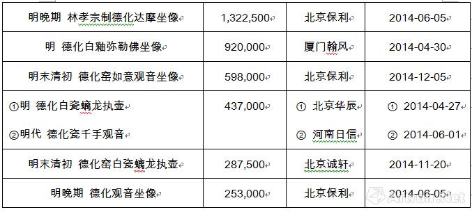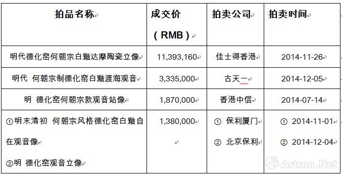 引言:2014年11月26日,明代德化窯何朝宗白釉達摩陶瓷立像在香港佳士得拍出了一千一百多萬,創(chuàng)下了德化白瓷的新紀(jì)錄。明代德化白瓷在我國瓷器發(fā)展史上具有特殊的地位,也是福建最具有代表性的藝術(shù)品類之一。興于宋元、盛于明清的德化白瓷是當(dāng)年“海上絲綢之路”的重要出口產(chǎn)品,十八世紀(jì)的法國人特意為它創(chuàng)造出一個專有名稱—“中國白”。幾百年來,德化瓷受到歐洲各國皇室貴族的“寵愛”,在世界各地許多博物館的館藏中都有它的身影,有的博物館還將其列為鎮(zhèn)館之寶,使德化瓷成為世界陶瓷文化遺產(chǎn)中的經(jīng)典項目,德化窯也被世界各國譽為世界的“官窯”。那么,除了何朝宗的那尊達摩立像外,2014年還有哪些德化瓷拍出了高價,這些高價德化瓷將為2015年的德化瓷藝術(shù)市場提供什么樣的創(chuàng)作與發(fā)展思路?