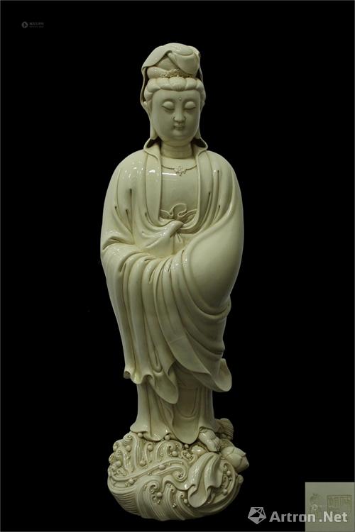此件觀音造像體型碩大,立姿,頭微左轉(zhuǎn),面若滿月,發(fā)如細絲,其發(fā)鬢高束,正中插如意形頭飾,頭戴風(fēng)帽,身批長巾,胸前佩荷花形纓絡(luò)佩,雙手交叉,足踩荷花立于波濤翻滾的海面之上。座底露胎,整器由手工挖芯捏塑而成,通體施釉,色若牙白。觀音造型優(yōu)美,刀法深刻銳利,衣紋流轉(zhuǎn)自然好似臨風(fēng)飄拂,且所塑顏容端麗,神韻灑脫,富有強烈的藝術(shù)魅力,充分展現(xiàn)了德化窯瓷塑高超的工藝水平。