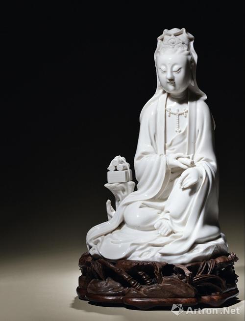 此件觀音跣足坐于洞石之上,身側(cè)豎立石臺,上置包袱經(jīng)卷。眉如彎月,雙目下視,鼻梁尖挺,唇角含笑,神態(tài)安詳。胸結(jié)如意形瓔珞,腕飾圓釧,手持經(jīng)卷,身著曳地襦裙,輕柔飄逸垂墜自然,體態(tài)嫻靜秀麗,手足刻畫細膩傳神;儀態(tài)柔美端莊,面如滿月,略帶微笑,神情慈祥恬靜。通體胎質(zhì)潔白緊致,釉色清亮潤澤。洞石嶙峋,衣紋飄逸,雕刻自然生動,質(zhì)感強烈,顯示了極高的工藝水平。