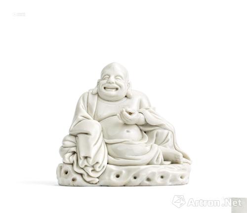 布袋和尚為五代后梁時期之僧人,明州奉化人。因常背負一只布袋,又稱布袋和尚,有其即為彌勒菩薩化身的說法廣為流傳。此件布袋和尚像以白瓷燒塑,頭頂起丘,容貌飽滿,大耳垂肩,慈祥和藹。半披衣服袒胸露腹,右手依靠布袋,左手放置左膝,食指小指輕挑。兩腿蜷縮兩足相合坐于地上,衣褶相迭,垂然而下。雕像造型生動,動態(tài)自然,栩栩如生。