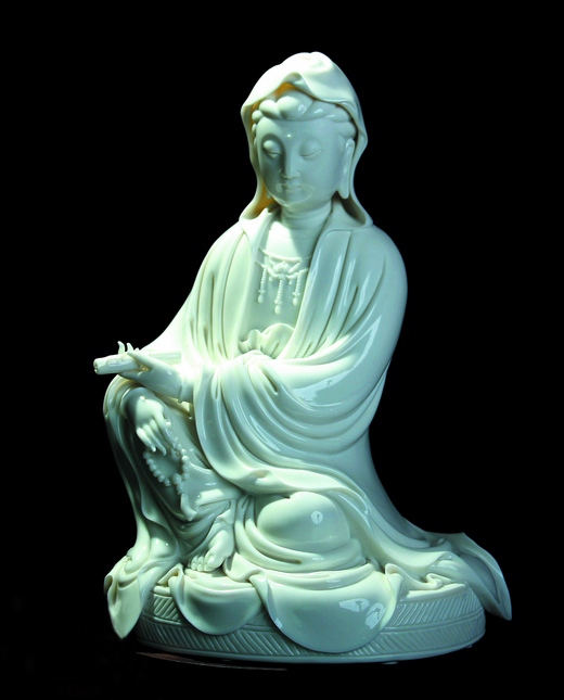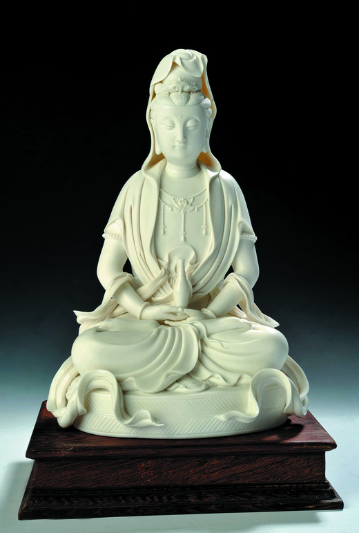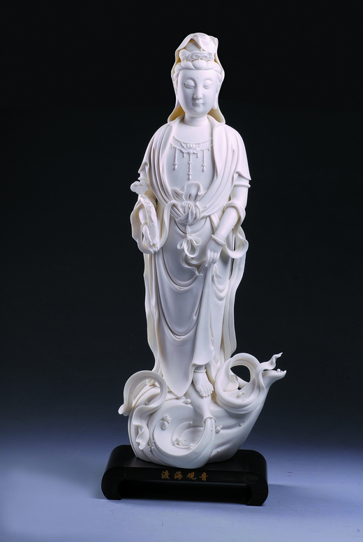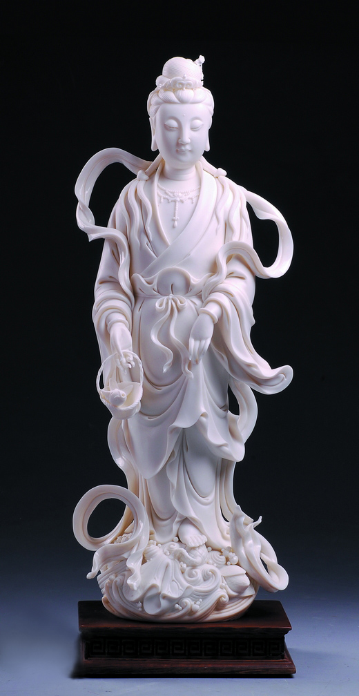 作品《魚籃觀音》便深具林吉祥自己的標(biāo)簽。觀音赤足站立荷葉之上,下承水浪激涌,胸飾珠串,著通肩衣袍,右手提籃,左手持裙,垂目肅靜安詳。這件作品最引人注目的除了觀音面部的恬靜安詳、氣韻生動以外,還有其周身環(huán)繞的長飄帶。這些長飄帶不但燒制困難,更能充分發(fā)揮出線條對人物造型的重要作用,“以線刻體、以體托線、線體結(jié)合”,烘托出人物的精神氣質(zhì)和內(nèi)在性格,表現(xiàn)出一種細(xì)膩、纖巧的形式美。