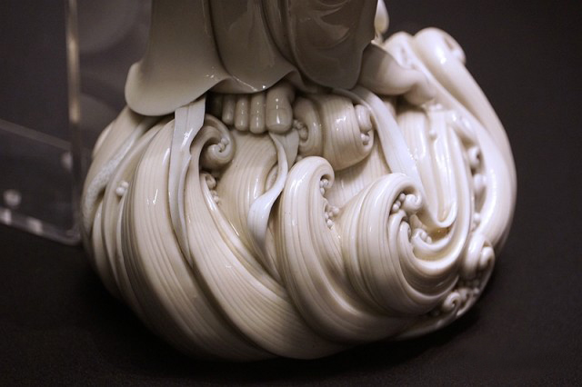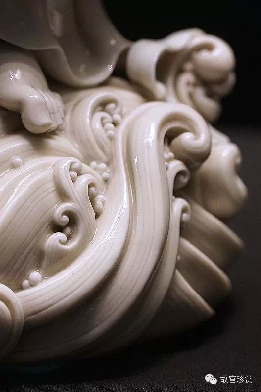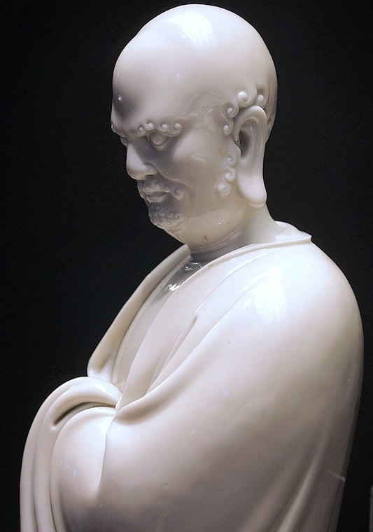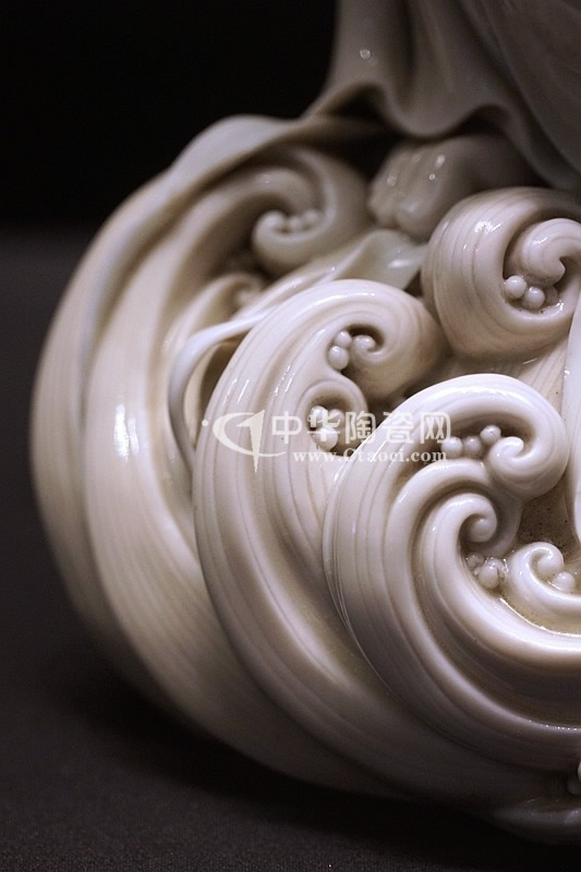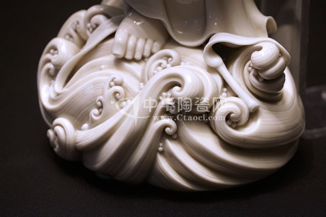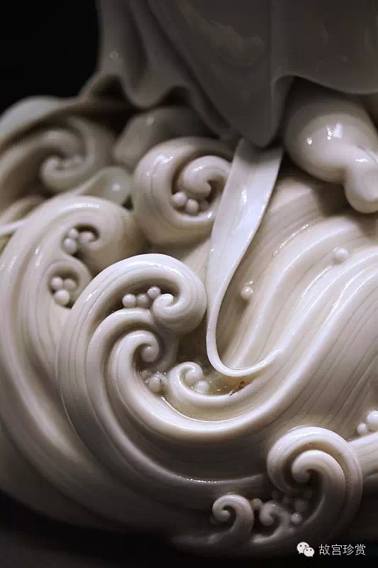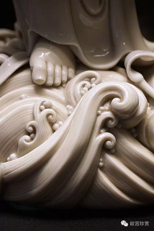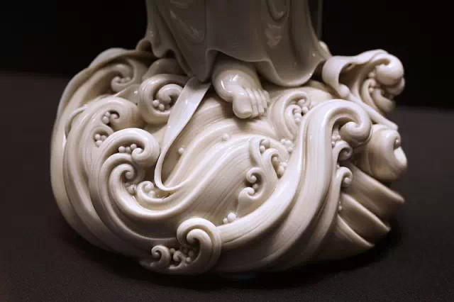 而何朝宗最為精彩的傳世瓷塑名作《達摩立像》,這件立像與其他德化窯瓷塑人物一樣,體量不大。但卻將波濤之上一葦渡江的達摩表現(xiàn)得維妙維肖。何朝宗所作此像,在精準(zhǔn)優(yōu)美的人物形象塑造和令人叫絕的衣紋水波再現(xiàn)之外,正所謂——妙不可言。