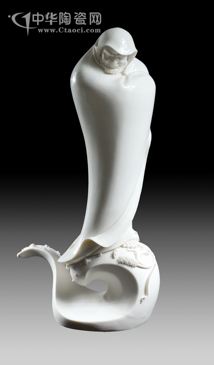 作品以達(dá)摩過(guò)江為題材,腳踩蘆葦而至,全身僧衣緊裹,以睿智的目光俯視著常人難以征服的江水。翻滾的江浪簡(jiǎn)單處理出基本型, 不僅和整體的風(fēng)格統(tǒng)一,更增加了整件造型的飄逸感和燒成難度。作品經(jīng)電窯48小時(shí)的升溫、恒溫、保溫,燒成溫度達(dá)到1310度。成品的尺寸為:高52公分,寬28公分,深度17公分。德化優(yōu)質(zhì)的中國(guó)白瓷泥,使整件作品達(dá)到含而不露的藝術(shù)效果,更好地表現(xiàn)出禪宗達(dá)摩動(dòng)靜一如的高超境界。