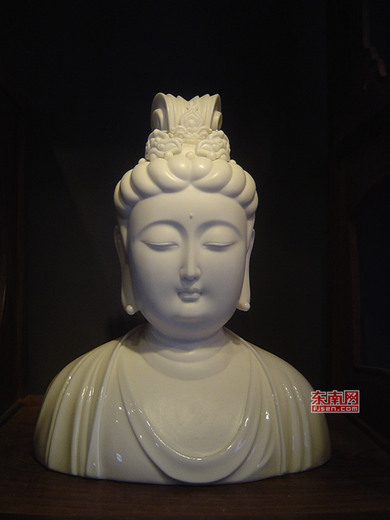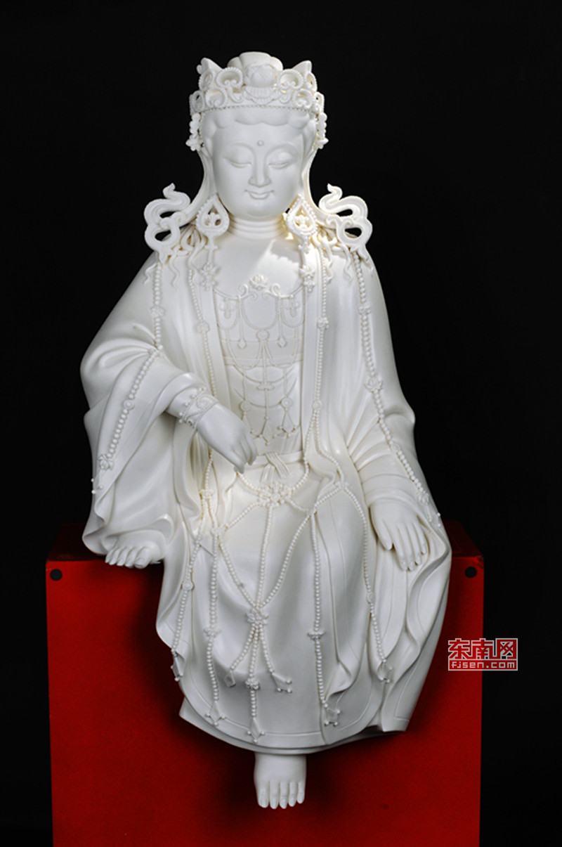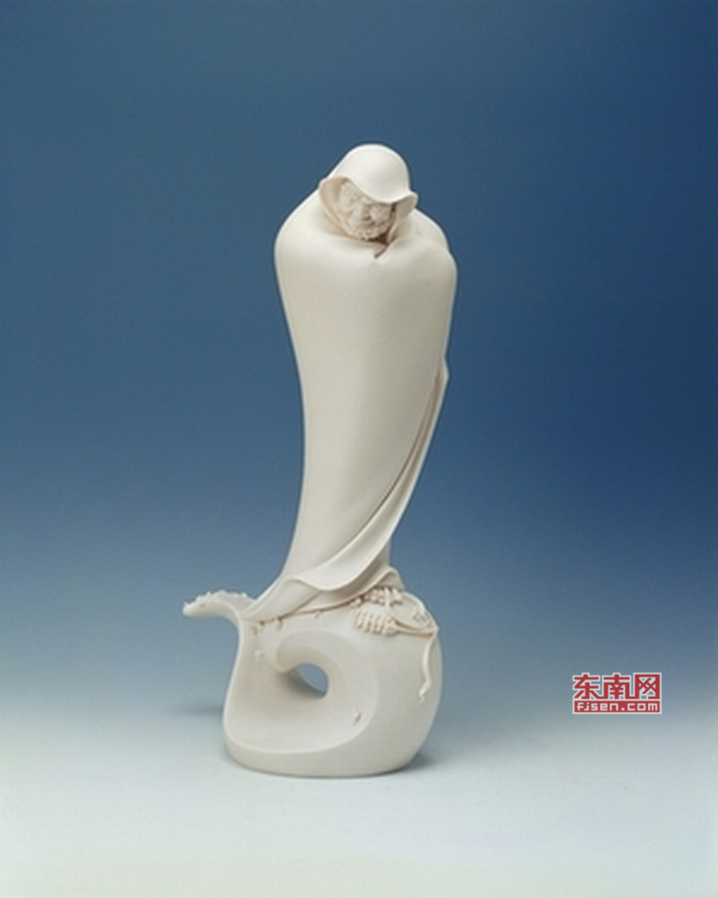 在他的理解里,德化陶瓷人物造像的開(kāi)山宗師何朝宗著名的觀音作品,便是“閃爍著人性光芒”的經(jīng)典之作,最著名的《渡海觀音》,觀音將雙手優(yōu)雅地藏于衣袖之中,優(yōu)雅略帶著矜持,她雙目低垂,神態(tài)悠閑自在,臉上投射出恬靜柔美之光,如同古玉一般。