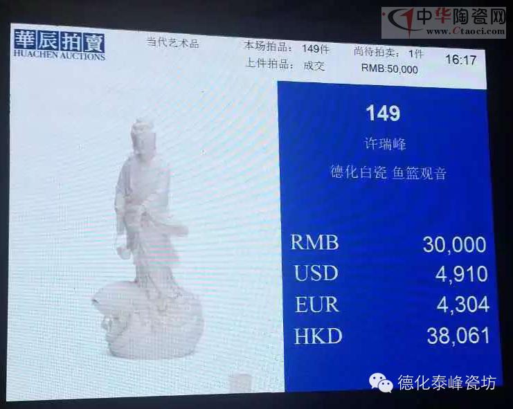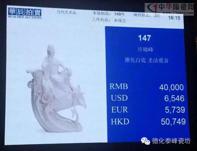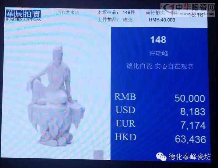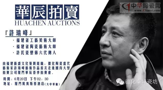 由福建藝盛文化策劃組織,德化百年瓷藝世家許氏第六代傳人、當(dāng)代藝術(shù)家許瑞峰的個(gè)人藝術(shù)作品首次走進(jìn)國(guó)內(nèi)大型拍賣公司廈門華辰春季拍賣會(huì)。6月20日,廈門華辰春季拍賣會(huì)圓滿落幕,拍出藏品總成交金額五千多萬元。
