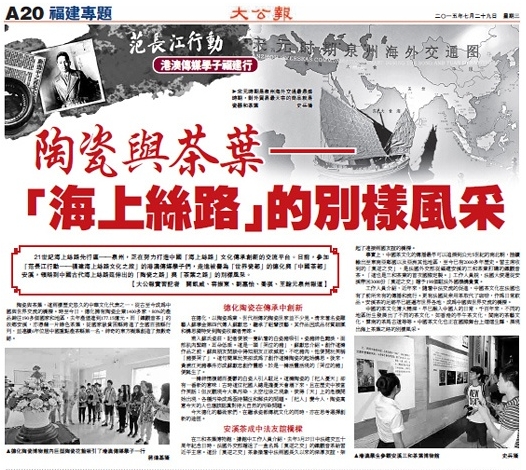 21世紀(jì)海上絲路先行區(qū)——泉州,正在努力打造中國(guó)“海上絲路”文化傳承創(chuàng)新的交流平臺(tái)。日前,參加“范長(zhǎng)江行動(dòng)——福建海上絲路文化之旅”的港澳傳媒學(xué)子們,走進(jìn)被譽(yù)為“世界瓷都”的德化與“中國(guó)茶都”安溪,領(lǐng)略到中國(guó)古代海上絲路延伸出的“陶瓷之路”與“茶葉之路”的別樣風(fēng)采。(大公報(bào)實(shí)習(xí)記者關(guān)凱威、容振東、劉嘉怡、喬祺、王翰元泉州報(bào)道)