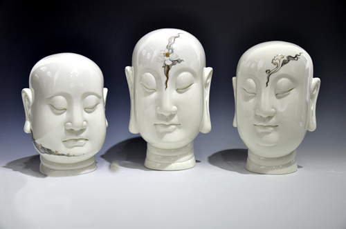 作品實(shí)為作者內(nèi)心自白,將瓷塑與瓷彩結(jié)合,以一組三種表情各異的臉相,飾以相應(yīng)指征的裝飾圖形,表現(xiàn)修道的三重境界,與豐子愷先生一再倡導(dǎo)的“俗世、藝術(shù)、人生”三境界相侔!兜厣纤繁砬楸瘧、百欲纏身,有濁氣、俗氣!短焐显啤沸σ庥,有理想、有向上的清氣!缎闹猩彙烦裁撍,不悲不喜,如蓮化初綻,證得大道。三頭像線條剛勁大氣,表情與裝飾暗示作者的人生體悟,在在燦爛著心靈追索的光輝。