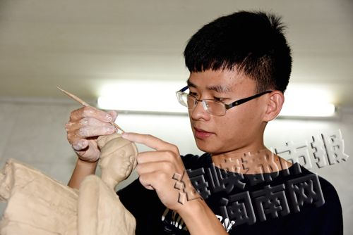 高中讀理科的黃偉硼說,選擇泉州工藝美術(shù)職業(yè)學(xué)校,就是想讀雕塑專業(yè),但因沒有美術(shù)功底,剛開始學(xué)校不同意他跨系轉(zhuǎn)專業(yè)。后來了解到黃偉硼出自佛雕世家,有一定的實(shí)踐功底,才讓他破了例。