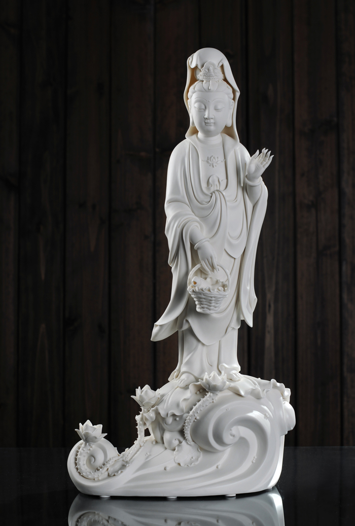 作品簡介:此尊觀音像高47厘米,底長24厘米,寬16厘米,頭髻發(fā)束,面容慈祥,寬袖衣裙、手提竹籃、腳踏鰲背,釉面光潤明亮,胎質(zhì)致密透光,雕塑精細(xì),采用堆花、貼花、鏤空、刻畫等多種工藝,使觀音衣褶裙帶線條流暢、洗練,形象栩栩如生。
