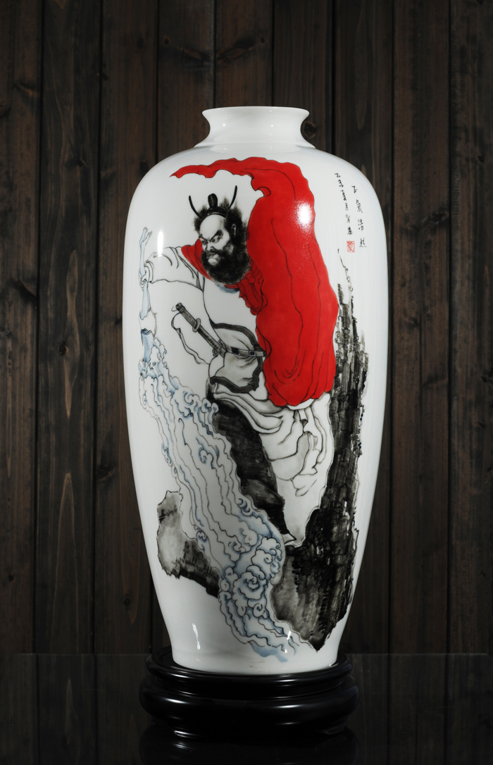 作品簡介:瓷瓶畫是在書畫的基礎(chǔ)上發(fā)展起來的一門藝術(shù),它融瓷器工藝與書畫藝術(shù)為一體,既顯示了畫家的藝術(shù)水平,也展示了工匠的高超技藝。它不是藝術(shù)品單純的復(fù)制和搬用,而是采用多種工藝進(jìn)行制作,精工細(xì)雕,一絲不茍,從而使其達(dá)到了毛筆在宣紙上作畫的筆墨效果和韻味!剁娯浮纷髌啡趥鹘y(tǒng)、現(xiàn)代及瓷畫技法精華于一爐,鐘馗豹頭環(huán)眼,鐵面虬髯,相貌奇異,線條凝練,筆無妄下,造型威美,氣象通神,品高韻雅。