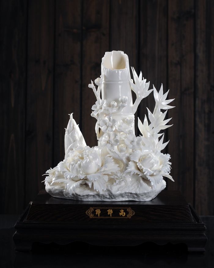 作品簡介:作品以德化特有的溫潤如玉,素凈淡雅的“中國白”為胎質(zhì),塑造了千嬌百媚的鮮花,以白瓷來展示花的質(zhì)感,傳神地展現(xiàn)花的造型,花的風(fēng)骨,花的神韻等,賜予瓷花鮮活的生命,塑造出了“風(fēng)情萬種”,”繁花爭艷”的世界,烘托出瓷都德化陶瓷技藝的燦爛春天。整件作品色澤潔凈淡雅,細(xì)膩溫潤,極具藝術(shù)表現(xiàn)力。