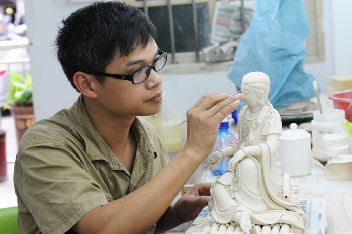 陳廷實(shí)先后師從數(shù)位瓷塑大師,經(jīng)過(guò)10多年的苦心學(xué)藝,精通拉坯、塑像、雕刻、燒窯等高難技術(shù),期間除了閱讀大量的宗教、陶瓷、藝術(shù)類(lèi)書(shū)籍,還四處拜訪名師。所創(chuàng)作作品以觀音、彌勒和古代神像為主,作品造型務(wù)實(shí)、嚴(yán)謹(jǐn)、質(zhì)感強(qiáng)烈,并恰當(dāng)?shù)剡\(yùn)用了線條在瓷雕中的表現(xiàn)力,結(jié)合德化陶瓷“白”、“潤(rùn)”、“飽滿(mǎn)”等特性更好地加以展示,從立意到表現(xiàn)手段,在繼承傳統(tǒng)制作工藝基礎(chǔ)上敢于創(chuàng)新。寶劍鋒從磨礪出,梅花香自苦寒來(lái),經(jīng)過(guò)二十多年的學(xué)習(xí)創(chuàng)作,陳廷實(shí)作品多次在評(píng)比大賽中榮獲金、銀、銅獎(jiǎng),被數(shù)家博物館、名寺院收藏,深受廣大陶瓷藝術(shù)愛(ài)好者喜愛(ài)。
