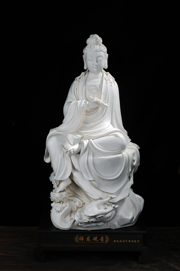作品胎體滑潤(rùn)致密、如凝脂凍玉。觀音菩薩頭梳高髻,面容清秀,鳳眼微啟,雙眼低垂,唇角深凹,微微上翹,浮現(xiàn)出一絲若隱若現(xiàn)的笑意,顯得飽滿(mǎn)秀美、妙麗莊嚴(yán)。凝神靜思,赤足坐于巖石上。全身衣飾繁縟得當(dāng),衣紋飄逸流暢,裝飾簡(jiǎn)潔自然。2013年11月在第十五屆中國(guó)(國(guó)家級(jí))工藝美術(shù)大師精品博覽會(huì)中榮獲中國(guó)工藝美術(shù)‘金’獎(jiǎng)。