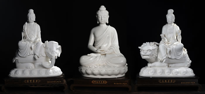 娑婆世界教化眾生的釋迦牟尼佛,左脅侍菩薩是以智慧聞名的文殊菩薩,右脅侍菩薩是以大行聞名的普賢菩薩,三者合稱(chēng)釋迦三尊。作品文殊普賢通體潔凈亮白,手持法器,端坐獅象之上,文靜賢淑。五官刻畫(huà)到位,冠飾、瓔珞制作精美。如來(lái)大耳垂肩,面形豐滿(mǎn)圓潤(rùn),眉如彎弓,雙目俯視,神態(tài)沉靜內(nèi)省。雙手持禪定印,捧法器于膝上,安靜祥和,潛心修煉。 作品在2016年8月山東濟(jì)南24屆珠寶玉石文玩藝術(shù)品展覽會(huì)中被評(píng)為‘金’獎(jiǎng)。