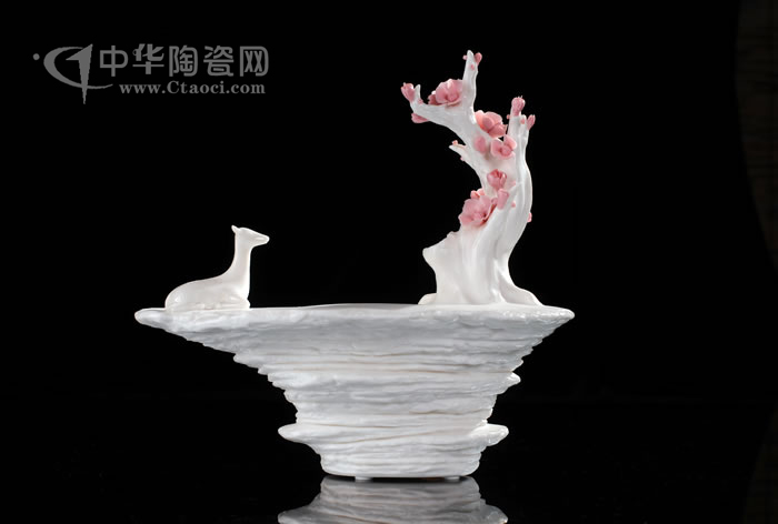 新銳青年陶藝家鄭清海作品,風化狀的巖石上,平滑如鏡,一株梅花傲立枝頭,一頭小鹿乖巧凝視。作品以德化白瓷為表現(xiàn)形式,素雅自然,純手工捏制的梅花使作品更為精細。