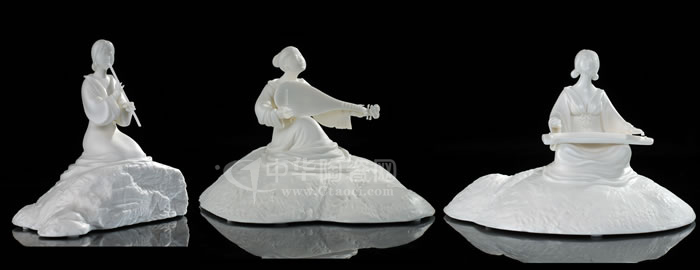鄭清海師承中國陶瓷藝術大師蘇獻忠,作品瓷質細膩,工藝精湛。女子神采婀娜、優(yōu)雅,靜坐于巖石,演奏長笛、琵琶、古琴,意境美好。鄭清海手刻簽名,具有較高的收藏價值。