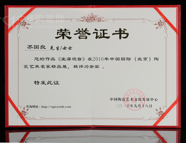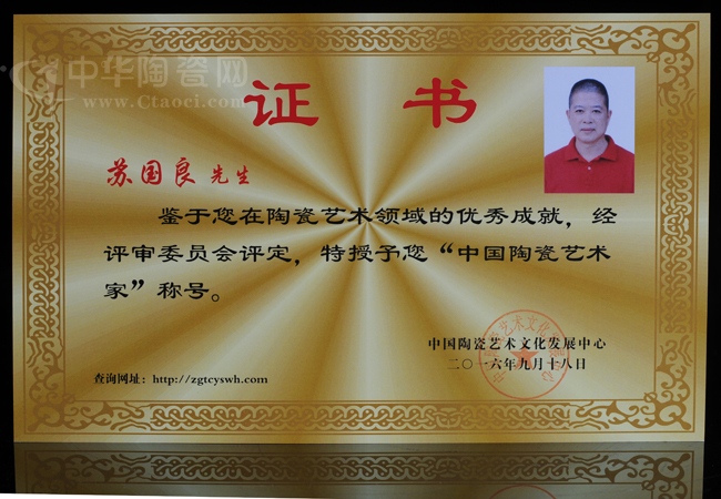 2016年9月,鑒于蘇國良在我國陶瓷藝術領域取得的突出成就,經(jīng)中國陶瓷藝術文化發(fā)展中心評審委員會評定授予蘇國良“中國陶瓷藝術家”稱號。