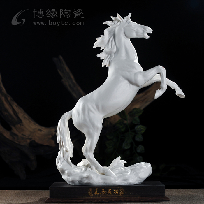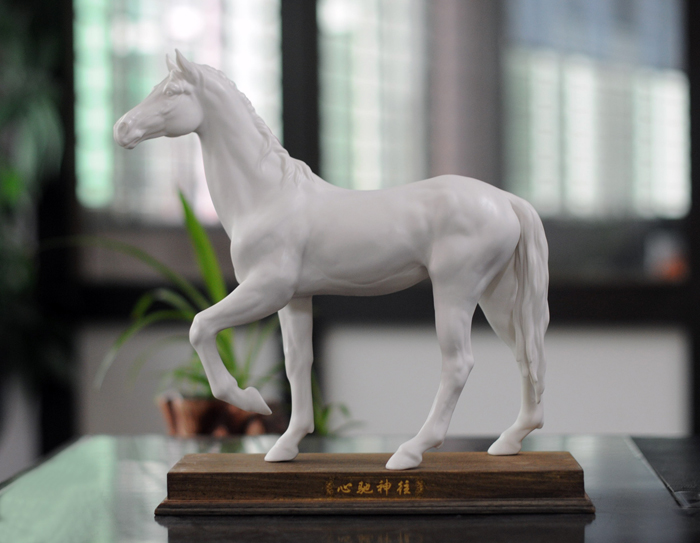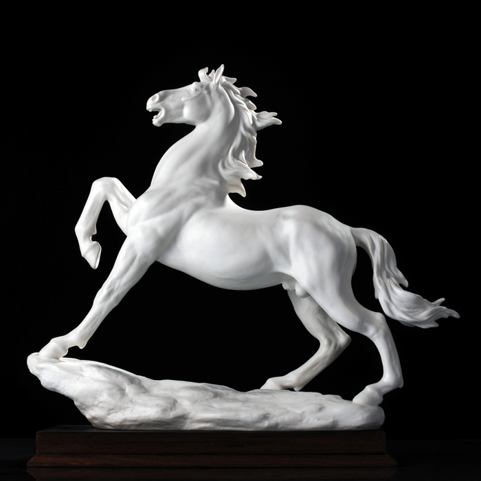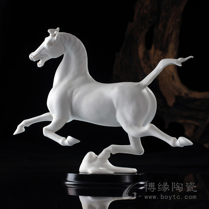 但凡了解瓷塑的人都知道,由于瓷器要經(jīng)過一千多度高溫的燒煉,最高溫時的瓷胎會呈現(xiàn)一種熔融狀態(tài),如果胎體重心不穩(wěn),燒煉中極容易變形甚至癱倒成為廢品,因此瓷塑的底部從工藝角度講,應(yīng)該越敦實(shí)越好。尤其對馬的四條細(xì)長腿,瓷塑家都會盡量避免如實(shí)塑造。這樣四蹄飛揚(yáng)的瓷馬----四只翻飛的馬蹄都交代得清清楚楚,站立得穩(wěn)穩(wěn)當(dāng)當(dāng),實(shí)屬難能可貴!