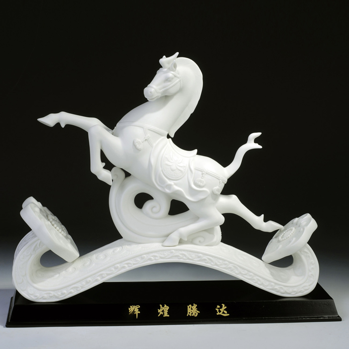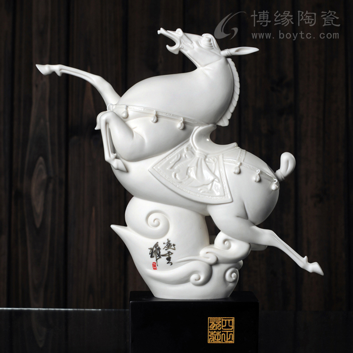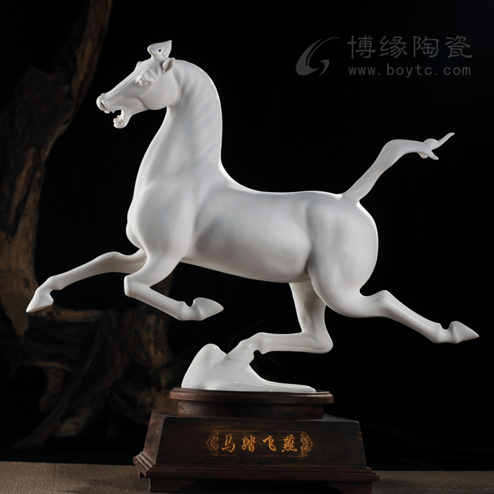 “馬踏飛燕”原文物是一件青銅器,青銅質(zhì)材單腿曲立當(dāng)然就沒有工藝難度,何況不經(jīng)火燒。而這件瓷塑“馬踏飛燕”,造型精準(zhǔn)不說,居然靠著一條細(xì)而彎曲的腿撐住了馬的碩大身體,并經(jīng)過千度以上高溫火的洗禮而毫無失重感,簡直讓人不可思議!