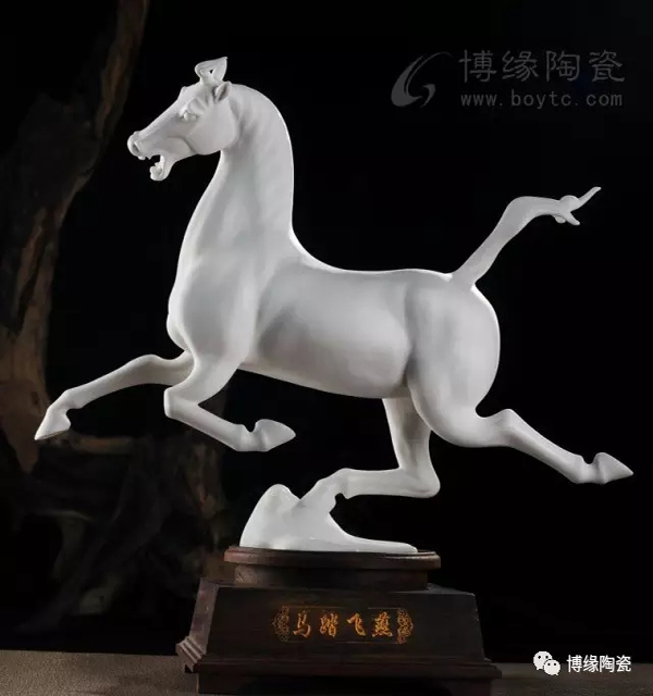 “馬踏飛燕”原文物是一件青銅器,青銅質(zhì)材單腿曲立當(dāng)然就沒(méi)有工藝難度,何況不經(jīng)火燒。而這件瓷塑“馬踏飛燕”,造型精準(zhǔn)不說(shuō),居然靠著一條細(xì)而彎曲的腿撐住了馬的碩大身體,并經(jīng)過(guò)千度以上高溫火的洗禮而毫無(wú)失重感,簡(jiǎn)直讓人不可思議!
