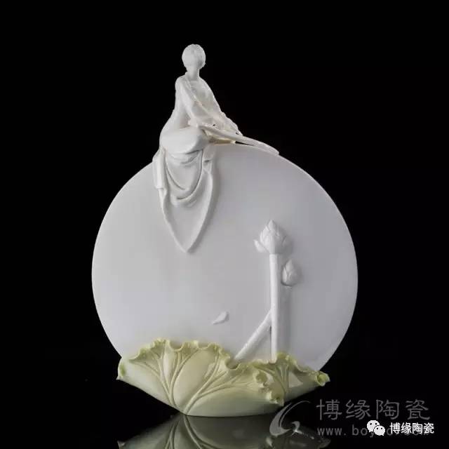 首屆福建省陶瓷產(chǎn)品設(shè)計(jì)職業(yè)技能競(jìng)賽三等獎(jiǎng),林彬彬師承中國(guó)陶瓷藝術(shù)大師蘇獻(xiàn)忠,整件作品安寧靜謐,以簡(jiǎn)潔卻很有視覺沖擊力的鏤空大月亮為主體,點(diǎn)綴上幾朵亭亭的清荷,美麗的姑娘恬靜淡然地端坐在月亮之上,靜靜地聆聽萬物生靈溫婉悠揚(yáng)的呢喃,又仿佛攜帶著一抔愁緒遙寄遠(yuǎn)方。