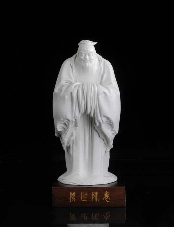 當代德化實力派陶藝家鄭志德作品代表作品。作品以德化溫潤如玉的“中國白”為胎質(zhì),手工制作,胎骨潔白,堅實致密,有凝脂似玉之感?鬃由碇L袍,面相莊重慈祥、沉靜肅穆。作品工藝精湛,衣紋流暢飄逸,體態(tài)豐隆,把孔子雕刻得活靈活現(xiàn),并與歷史記載中“溫而厲,威而不猛,恭而安”的形象吻合。
