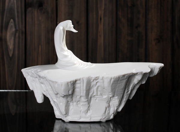 作品中,他創(chuàng)造性地將老者的衣物刻畫得如水般,與高臺融為一體,作品以德化白瓷為表現(xiàn)形式,素雅自然。