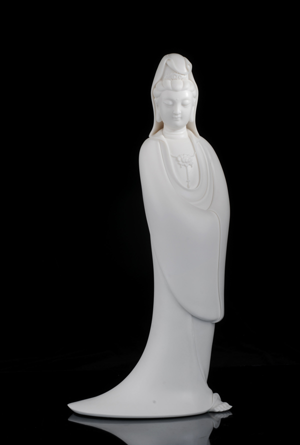 作品繼承德化“何派”傳統(tǒng)風格加以創(chuàng)新,觀音面部低首垂目、飽滿豐潤、神情慈祥,似在俯瞰塵世眾生。人物的珠串、花飾手工捏塑而成,細致逼真。觀音衣紋自然,線條流暢、飄逸,作品不僅具有古典風格又不失有現(xiàn)代家居美感。