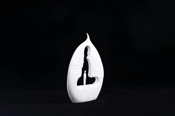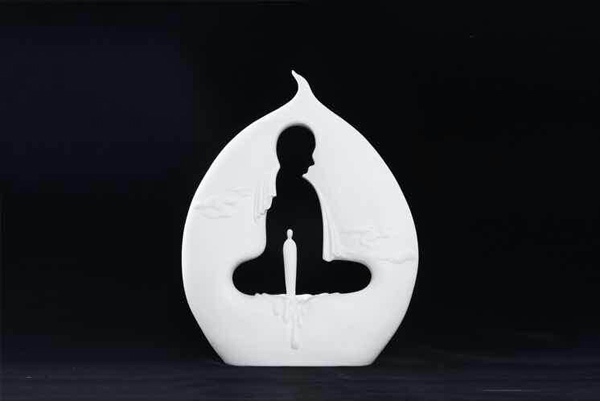 作品含義:作品以菩提葉為主體態(tài),云水之間,有一人的側(cè)影,另一人代表一種信仰和意念,之所以側(cè)影展現(xiàn),是為了讓觀賞者從不同角度觀物。“云水禪心”作者想表達的是人生活在云水之間的大千世界中,首先要有一個善良的心(菩提心),生活雖漫長但充滿美的色彩,無論喜、怒、哀、樂,需要你有發(fā)現(xiàn)美的眼光和智慧以及空杯的心態(tài),又以側(cè)影來表現(xiàn)智慧,鏤空形式代表空間。此作品把文化、美德、智慧、信仰、空間完美融合,運用雕塑手法,充分體現(xiàn)作者的內(nèi)心情感。山高怎阻云飛,水本為禪,然水中明月盡虛妄,飛鳥方知山水音。一花一世界,一葉一菩提,無分無別,物因觀而存在,觀非看,乃心視。