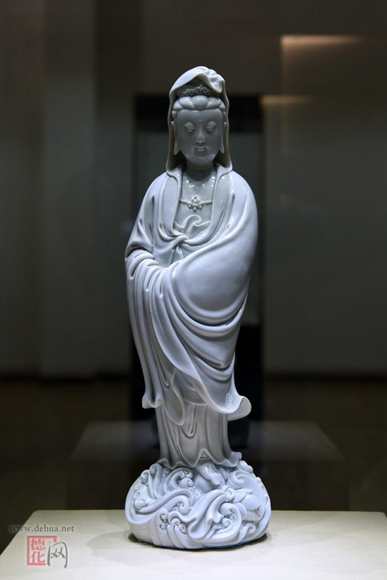一進(jìn)縣陶瓷博物館二樓展廳門,只見一尊“渡海觀音”映入眼簾,標(biāo)簽顯示高有 47厘米,精雕細(xì)刻,線條流暢,衣紋自然、飄逸,溫潤如玉,更展現(xiàn)其純凈、高雅的“東方女神”之魅力,令人嘆為觀止。