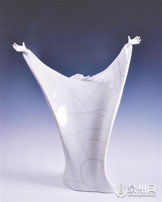 一件《天鵝湖》的作品吸引住記者的注意,三個(gè)美麗清秀的少女,身著薄如蟬翼的芭蕾舞裙,足尖輕輕一點(diǎn),手指柔美舞動(dòng)……絕美的藝術(shù)造型,讓人怦然心動(dòng)。紗裙絲絲紋路都非常清晰,讓人在驚贊德化白瓷的晶瑩潔潤(rùn)的同時(shí),更驚嘆創(chuàng)作者高超的技能。陳桂玉說(shuō),1993年她看到芭蕾舞劇《天鵝湖》時(shí)被深深打動(dòng),于是與丈夫數(shù)月的討論、嘗試、封存,再討論、再嘗試、再封存,于是就有了《天鵝湖》,這件作品獲得首屆中國(guó)工藝美術(shù)大師作品精品博覽會(huì)金獎(jiǎng)。