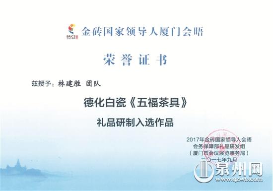 2013年,林建勝還發(fā)明了名貴瓷種——“玉黃瓷”。“玉黃瓷”采用德化上等高嶺土經(jīng)1333℃高溫?zé)贫,瓷質(zhì)泛黃,集脂潤(rùn)、純凈、細(xì)膩于一身,質(zhì)感有如“石中之王”田黃。