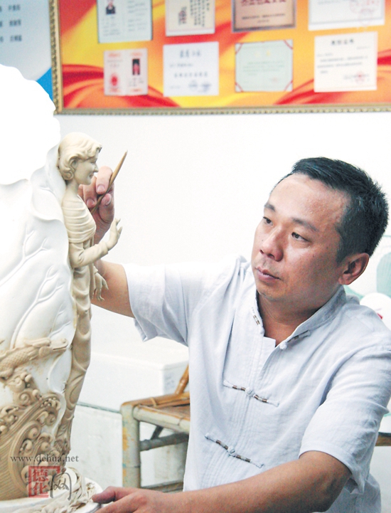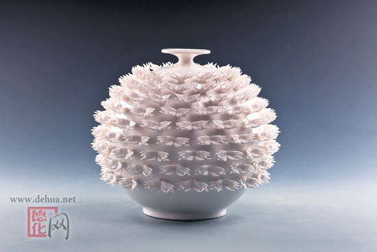 在公司展廳內,記者見到《明·渡海觀音》《明·披坐觀音》《白釉文昌帝君》等作品。“這些都是國寶復原作品”,他說,從2011年開始,他開始帶領團隊實施“中國風·瓷計劃”項目,復制德化陶瓷博物館內的作品,將德化窯優(yōu)良技藝再現(xiàn),并融合一些現(xiàn)代的創(chuàng)作理念,讓其成為新的文創(chuàng)產(chǎn)業(yè)。他說,推行“陶瓷+”模式,已成功打造“國寶復原·德化窯”“螭龍尊——大師瓷酒之道”“大師佛瓷之道”等工程。