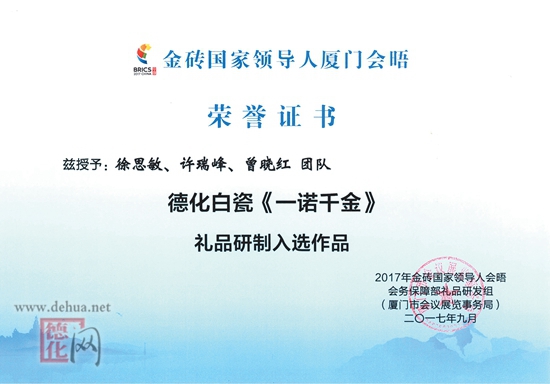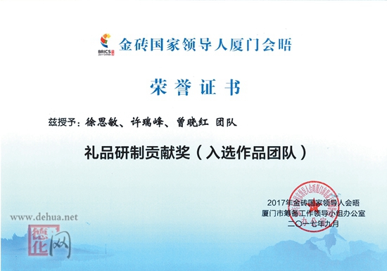 “國禮一定要有特定的難度,是無法輕易做到的寶貝級作品,這樣才顯大國風范,也更能體現(xiàn)創(chuàng)作者的匠心。”徐思敏說,他以象征承諾、誠信的印章為主體,創(chuàng)作了此次國禮作品《一諾千金》。因作品主題寓意深遠,他的設計稿很快從遴選中勝出。然而,真正的困難還在后面。由于作品被設計成長方形,而且體量較大,燒制期間他真正體驗了什么叫“十窯九不成”,不少精心雕塑的作品經(jīng)過燒制后全部失敗作廢,這讓他既痛心又有些氣餒。“作品難度太大,很難完美呈現(xiàn),短時間內沒辦法完成,我準備放棄了。”今年春節(jié)期間,他給德化縣委宣傳部長陳堅宏打電話時說道。第二天,陳堅宏來到他家中,與他促膝長談,鼓勵他迎難而上。此后,他重整創(chuàng)作思路,并暗下決心,一定要攻克難題。于是,他立即組織團隊,放棄休假時間開始加班,共同研究作品的成型問題。