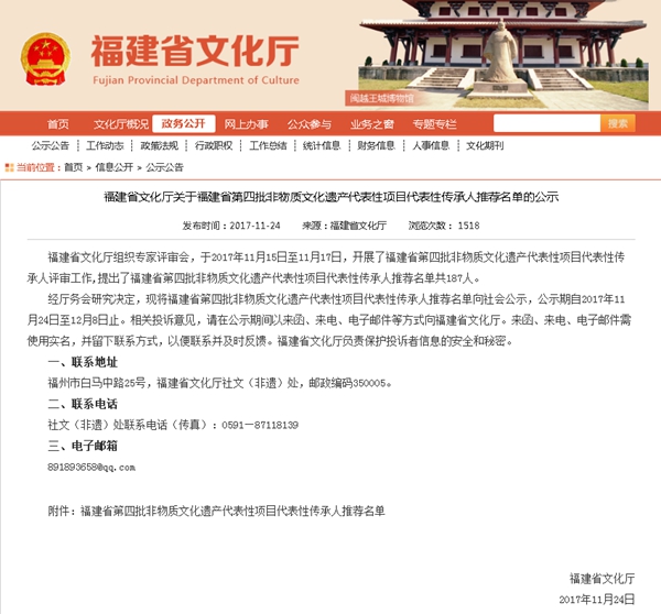 據(jù)悉,11月15日至11月17日,福建省文化廳組織專(zhuān)家評(píng)審會(huì)開(kāi)展了福建省第四批非物質(zhì)文化遺產(chǎn)代表性項(xiàng)目代表性傳承人評(píng)審工作,提出了福建省第四批非物質(zhì)文化遺產(chǎn)代表性項(xiàng)目代表性傳承人推薦名單共187人。名單目前正向社會(huì)公示,公示期自2017年11月24日至12月8日止。
