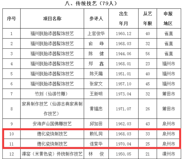 近日,福建省文化廳官網(wǎng)公示了福建省第四批非物質(zhì)文化遺產(chǎn)代表性項(xiàng)目代表性傳承人推薦名單。德化瓷燒制技藝傳承人賴(lài)禮同、連紫華上榜!